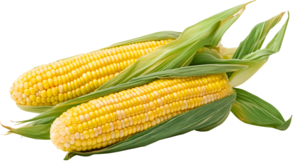 Two Fresh Corn Cobs with Green Husks Isolated on Transparent Background for Agricultural Concepts