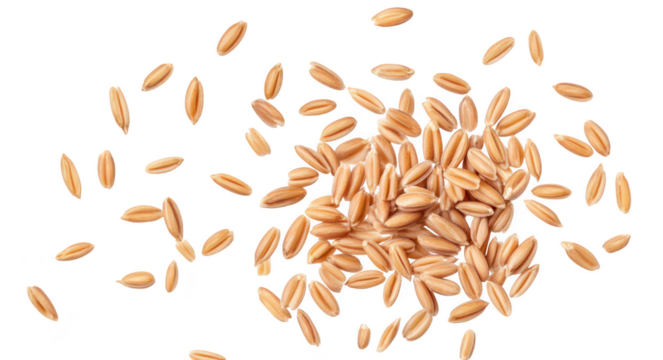 A collection of scattered golden wheat grains on a clean white background. illustrating the raw agricultural products texture and color. ideal for food-related projects or educational materials