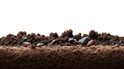 Rich brown soil texture with small clumps and granules, showcasing natural earth elements and organic material for agricultural use and gardening. Isolated on transparent background