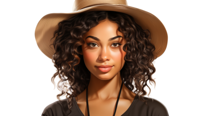 Transparent smiling woman holding bunch of red grapes with straw hat