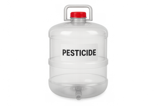 Pesticide liquid pouring from a white plastic bottle on a transparent background, ideal for agricultural or environmental themes