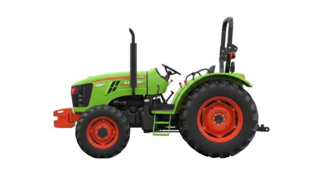 Isolated Green Tractor Side View, Farm Machinery for Agriculture and Landscaping Work