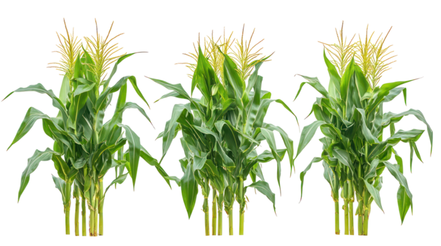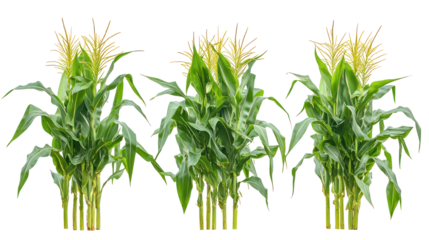 Three Sets of Corn Plants with Full View and Rich Green Leaves on Transparent Background