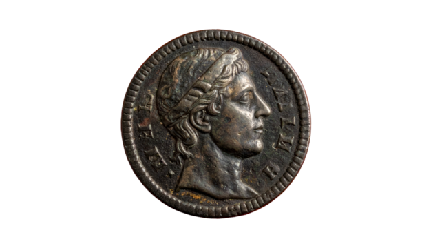 Ancient roman silver coins isolated on transparent background, featuring the portrait of caesar augustus and apollo, reflecting history and numismatics