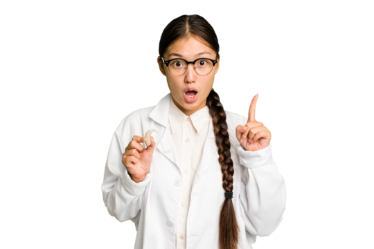 Young asian otorhinolaryngologist woman holding a hearing aid isolated having some great idea, concept of creativity.
