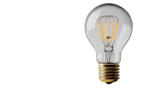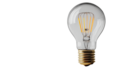 Vintage style light bulb with glowing filament, representing new ideas, innovation, and creative inspiration on transparent background