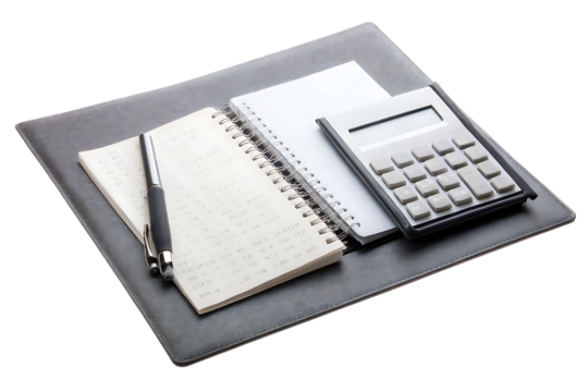 Business essentials notebook calculator pen isolated on a white background png ai generated