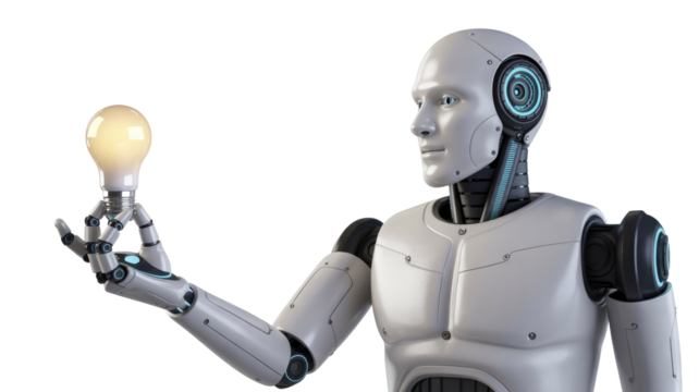Humanoid robot holding a bright light bulb, symbolizing artificial intelligence, innovation, and new ideas on a transparent background. background removed