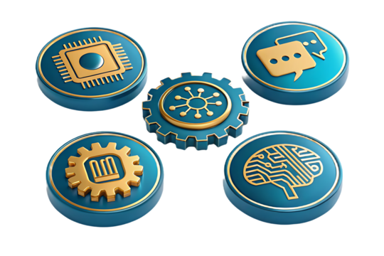 Ai concept icon showing a metallic gear with a glowing blue circuit board and ai letters on a transparent background