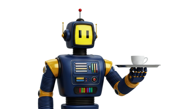 Robot waiter holding a cup of coffee on a tray