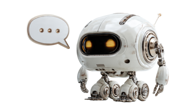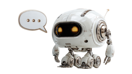 Cute friendly cartoon robot with a speech bubble indicating communication and conversation isolated on transparent background