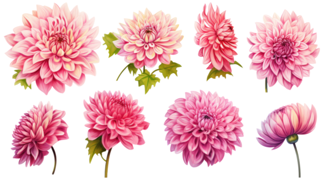 a collection of grunge oil painted dahlias isolated on a transparent background, generative ai