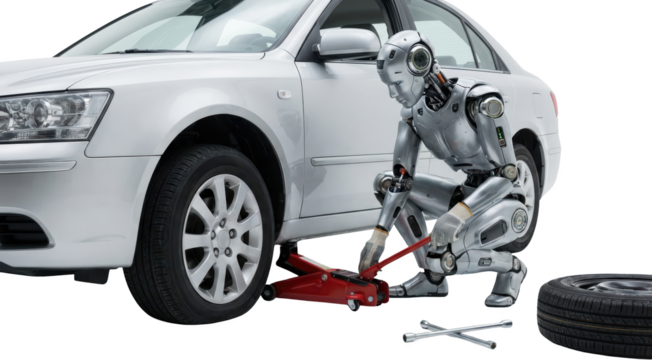 Futuristic humanoid robot changes a flat tire on a silver car using a jack and tire iron with a spare tire nearby car repair artificial intelligence future automotive