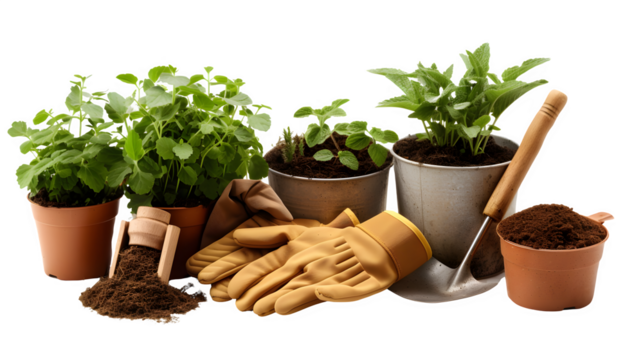 Gardening Tools with Potted Plants for Horticulture and Greenery, Isolated on White, Transparent Background, PNG File, Hand Edited Generative AI