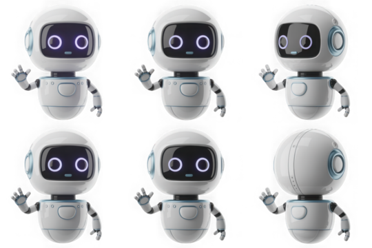 3d cute ai robot character in different angles. Chat bot mascot isolated render icon set. Digital artificial intelligence chatbot, friendly support assistant. Electric cyborg agent