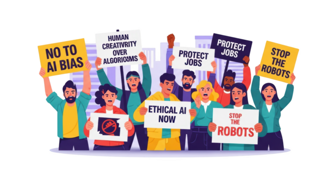 Crowd of People Protesting Against Artificial Intelligence and Robots. design creative background style inspiration