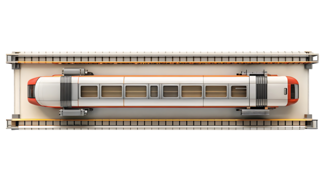 Passenger train, modern white and orange on light platform with yellow tracks, cutout, PNG, isolated on white or transparent background, AI