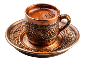 turkish coffee in traditional copper cup isolated on white background, png, ai generated.