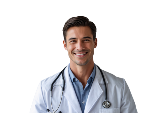 Portrait of a professional smiling male doctor with stethoscope, confident and approachable, generative AI,  isolated on a transparent background
