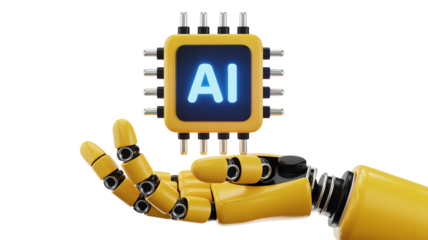 Robot hand holding AI microchip in futuristic yellow metallic finish with blue glow in soft studio lighting for technology advertisement