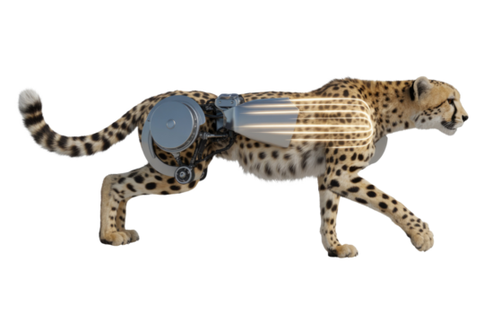 A biomechanical cheetah featuring a visible internal engine-like system with glowing energy lines, merging natural speed with advanced technology. background removed
