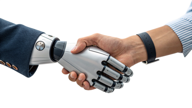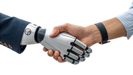 Human and Robot Handshake: Collaboration, AI, Future, Technology, Partnership, Innovation, Progress, Transparent Background,  Digital, Automation, Industry 4.0