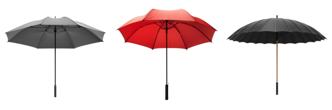 Set of A stylish black windproof straight handle umbrella made from thicken pongee material on transparent background. Ai generated