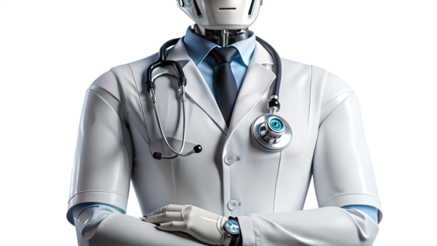 A robot doctor with stethoscope and lab coat isolated on transparent background, representing the future of healthcare and artificial intelligence in medicine