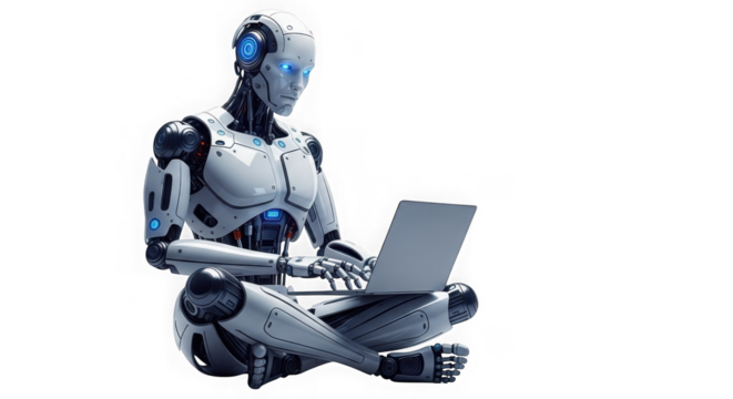 Futuristic robot collaborating on a laptop demonstrating advanced technology and ai transparent background