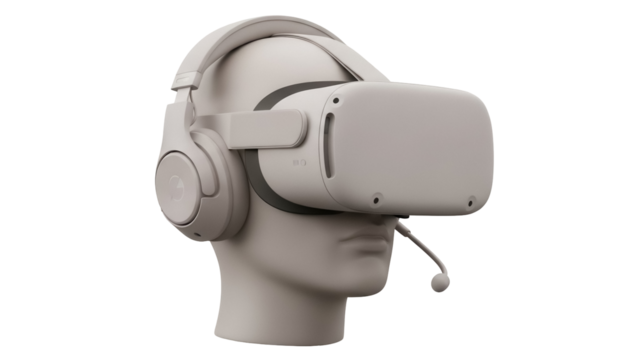 VR headset on mannequin head isolated PNG, virtual reality device for gaming and metaverse on transparent background