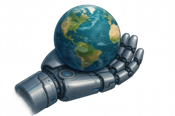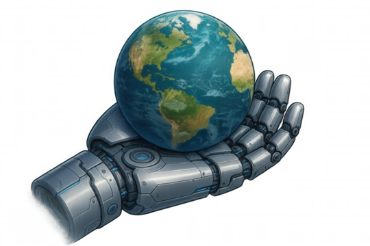 Robot hand holding planet earth, representing ai control, global impact, technology, and future responsibility