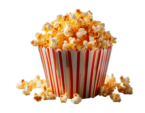 striped popcorn bag full of popcorn isolated on transparent background, generative ai