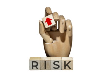 sztuczna ręka trzymająca kostkę z czerwoną strzałką w górę nad napisem na kostkach: RISK. Koncepcja zarządzania ryzykiem.