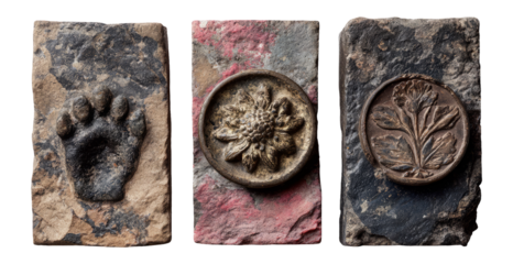 Three Isolated Stone Reliefs Featuring Animal Paw, Flower, and Plant
