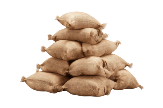 Stack of  brown burlap sacks.  Pyramid-shaped pile of  heavy-duty  fabric bags.  Tied  closures visible.  Isolated on  black background