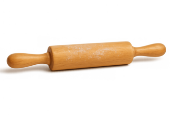 Wooden rolling pin with flour residue, an essential household kitchen utensil for baking, cooking, and preparing dough on transparent background