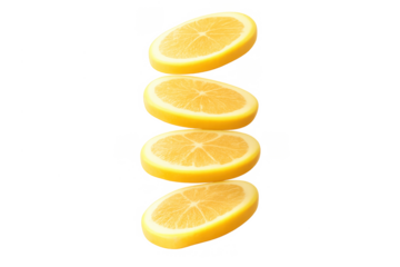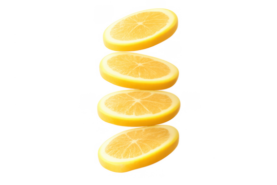Slices of yellow lemon fruit falling in a column, showing freshness and healthy eating on a transparent background