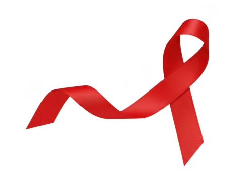 A single red awareness ribbon symbol representing support for aids and hiv causes, isolated on transparent background