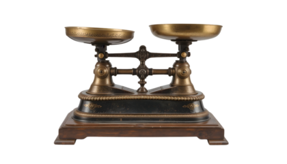 1800s American General Store Scale with Brass and Cast Iron Construction, Aged Wood Base and Patina, Isolated on White