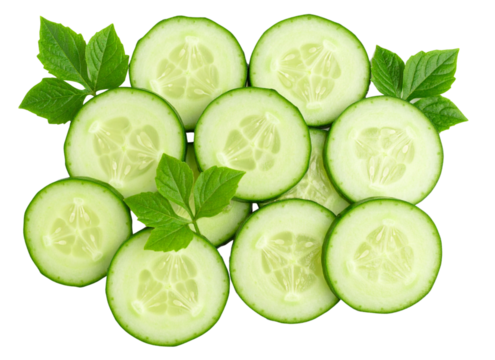Top View of Sliced Cucumber with Leaves in Fresh Flat Lay, Transparent Background