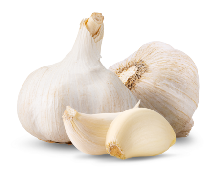 香り立つにんにくの房とむき身を並べたクリーンなフードビジュアル|背景なし・透過PNG・コピースペース