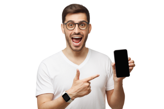 Young excited man in white t-shirt and glasses, pointing finger to blank screen of phone to viewer with WOW face