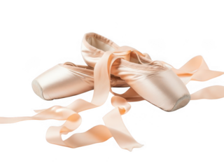 A pair of satin pink pointe shoes for ballet dance with ribbons untied, isolated on transparent background