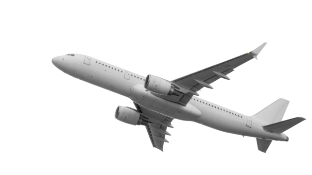 A passenger airplane, in a dynamic flight pose, isolated on a white background