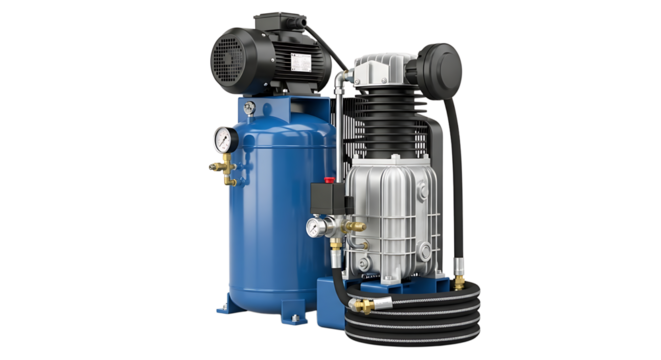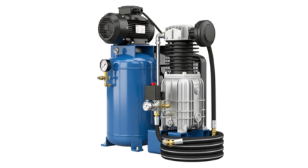 A blue air compressor with gauges isolated on transparent background