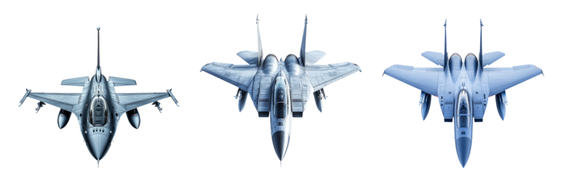 Three military fighter jets isolated on a transparent background, showcasing detailed designs