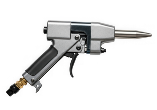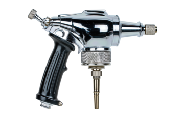 Professional spray gun featuring fine nozzle knurling and black grip, isolated on transparent background.