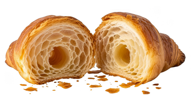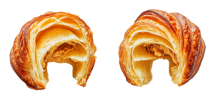 A single, perfectly baked croissant has a rich golden-brown, flaky crust with delicate, crispy outer layers and soft, airy folds visible in the texture isolated on white background. PNG file