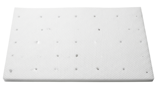 Rectangular sheet of white protective foam packaging with air holes on a transparent background
