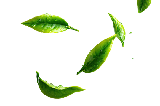 Fresh tea leaves, vibrant green, slightly curved, with water droplets, suspended in air against a black background